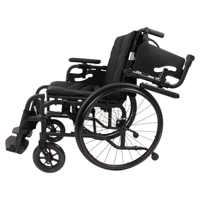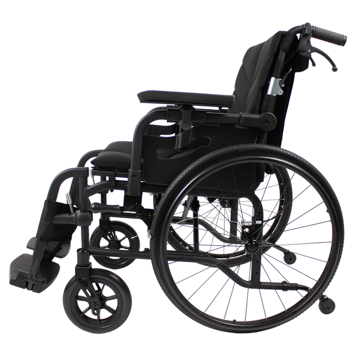 The oval tube frame design improves structural rigidity while maintaining a modern, matte black finish. This heavy-duty manual wheelchair balances reinforced strength with reduced overall weight, making it easier to handle than traditional, bulky reinforced models.